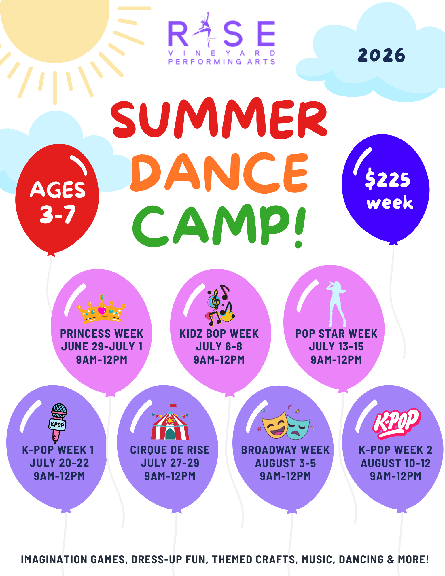 RISE OFFERS A WIDE VARIETY OF SUMMER CLASSES FOR DANCERS OF ALL LEVELS LOOKING TO CONTINUE THEIR TRAINING YEAR-ROUND OR TRY SOMETHING NEW. PLEASE CHECK BACK SOON FOR OUR 2026 SUMMER SCHEDULE AND REGISTRATION LINK. ANY QUESTIONS, PLEASE EMAIL US: INFO@RISEVPA.COM.
